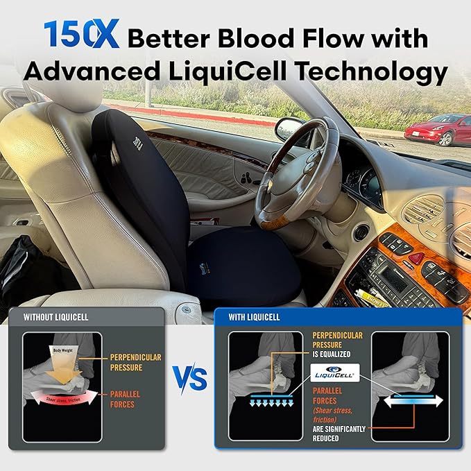 - ADVANCED LIQUICELL TECHNOLOGY : Unlike foam or gel cushions that compress and trap heat, Ergo21’s patented LiquiCell membranes reduce friction and shear while improving blood flow to the lower back and spine. This fluid-based system helps prevent pressure buildup, skin irritation, and stiffness—making it ideal for those with lumbar disc issues, sciatica, or chronic back pain. It supports healthy circulation and reduces strain during long hours of sitting.