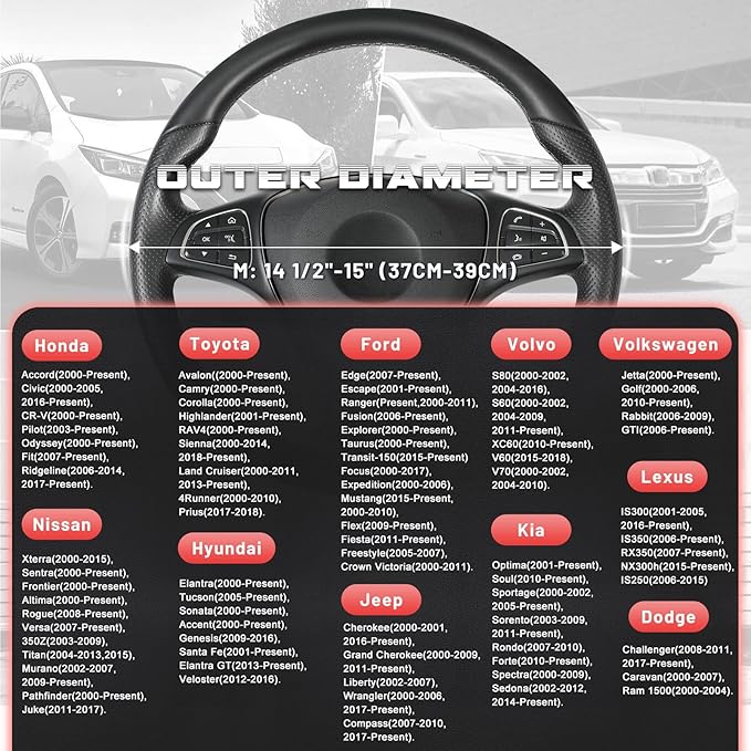 - READY TO INSTALL: Warm up the steering cover, and slip it on your steering wheel. Installation is fairly easy, any adult can install this steering wheel cover. Suitable for standard size steering wheels with outer diameter of 14 1/2-15 inches, please carefully measure the size of your steering wheel before purchasing.