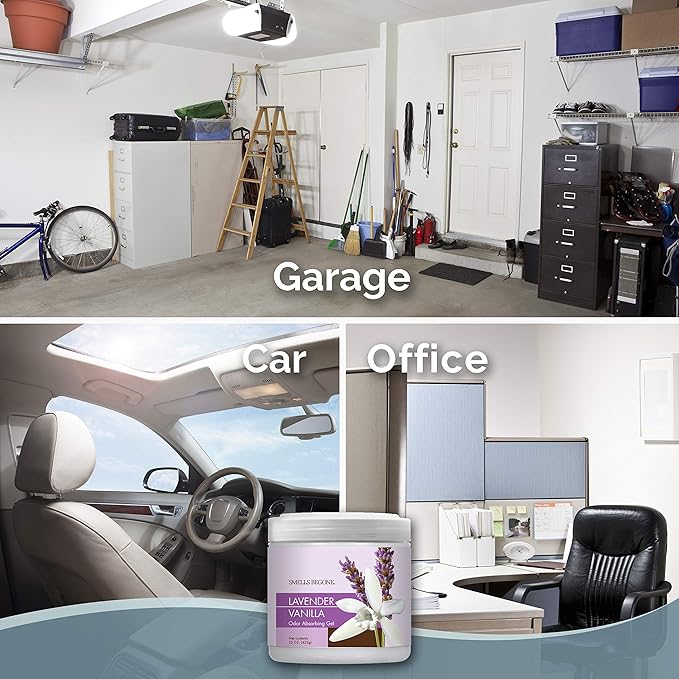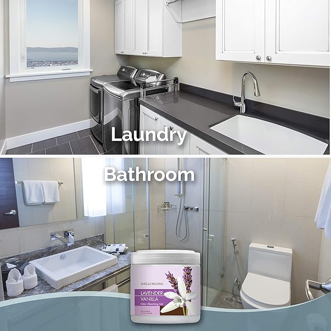 SMELLS BEGONE 15oz Gel Odor Eliminator - Absorb & Remove Tough Odors in Pet Areas, Bathrooms, Basements, Garage, Cars, RVs & Boats - Eliminate Odors Quickly (2-Pack, Lavender Vanilla)