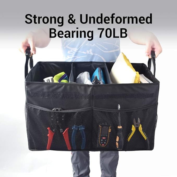 - ✔️【Car Organizer with Detachable Cover】-The collapsible trunk organizer for SUV is easy to use. You can place it not only in the trunk, but also in the front or rear seats or center of your vehicle. When you don't need to use it, you can fold it up for easy carrying and storage. The detachable lid keeps your goods out of sight for added security