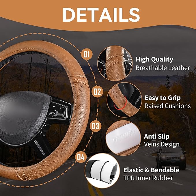 - ANTI-SKIP VEINS DESIGN. Make sure the steering wheel covers won't move during using time. Keep your safety all the item. A better grip on the wheel gives you more control on the road. Protected Your Hands and original steering wheel - protect your hands from burning hot steering wheels in summer and ice cold ones in winter.