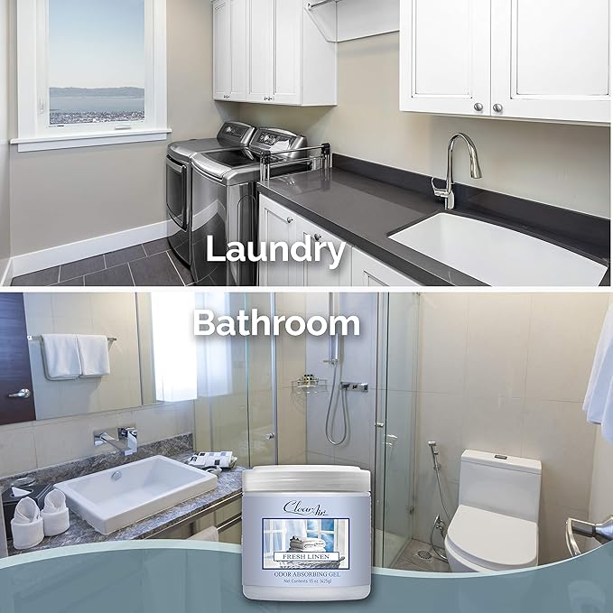 Clear Air 15oz Gel Odor Eliminator - Absorb & Remove Strong Odors from Pets, in Bathrooms, Basements, Garage, Cars, RVs & Boats - Eliminate Tough Odors with Essential Oils (Fresh Linen, 2-Pack)