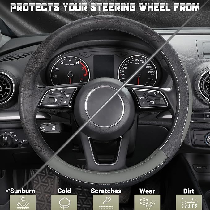 - NON-SLIP AND PROTECTION: Constructed from less slippery microfiber leather exterior and rubber lining, this car wheel cover adds secured safety performance when driving. It also protects your steering wheel from sunburn, scratches, fading, wear, and dirt.