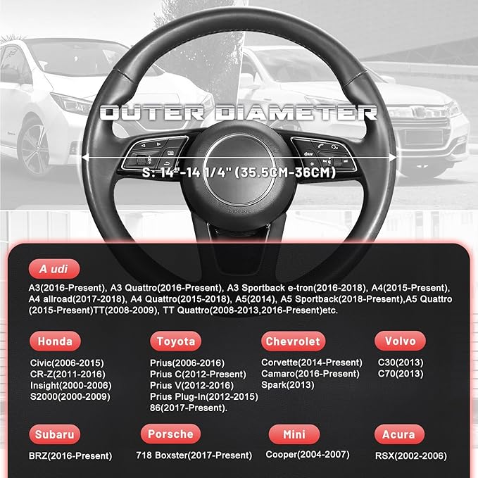 - READY TO INSTALL: Warm up the steering cover, and slip it on your steering wheel. Installation is fairly easy, any adult can install this steering wheel cover. Suitable for small size steering wheels with outer diameter of 14-14 1/4 inches, please carefully measure the size of your steering wheel before purchasing.