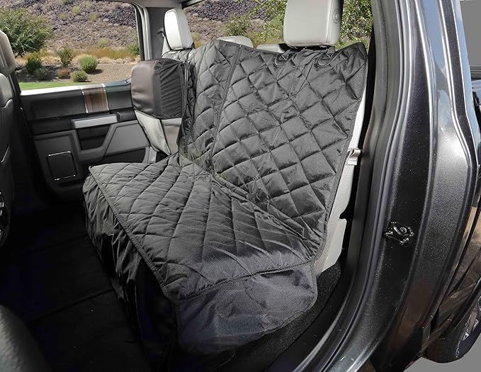 - FOR FULL-SIZE CREW CAB TRUCKS WITH 60/40 FILP-UP SEATS – Specifically engineered for full-size crew cab trucks with 60/40 fold-up split rear bench seats, this truck back seat pet cover for dogs offers durable protection against pet hair, dirt, and spills. It features a hammock design and 4Knines Split-Tech for easy access to fold-down seats and the middle armrest.