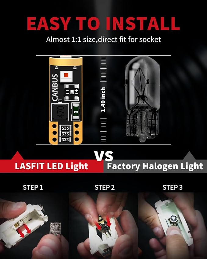 - 【CAN-BUS Ready】LASFIT 194 168 led bulbs Red have built-in CANBUS system, compatible with 98% vehicles, preventing from error code, odd flickering, and radio interference. However, these bulbs still can't prevent some Mercedes-Benz, VW, Jeep(when the replacement for license plate light and parking light) from throwing an error code.