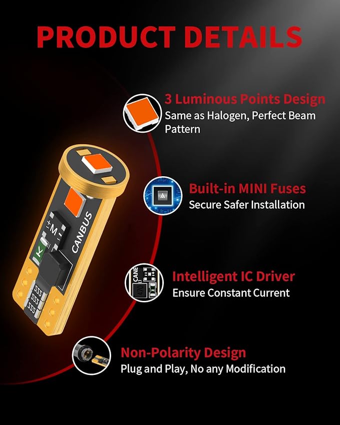 - Safe Driving & Long Lifespan】Loaded with mini fuses to prevent the led bulb from burning out by the excessive instant current to ensure safer installation. Efficient heat dissipation for low energy consumption to ensures the 168 bulb work 30,000+ hours. These LED bulbs have 1-year warranty, if they have any problem upon installing or after use, please contact us directly to get replacement.