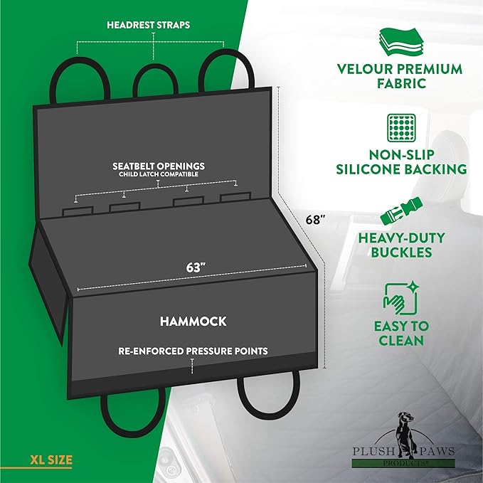 - ššš¦š¬ š§š¢ šš”š¦š§ššš: This back seat car cover comes in various sizes, REGULAR - 55''W X 60''L / EXTRA LARGE - 63''W X 68''L / BOTH HAVE - 9'' X 18'' SIDE FLAPS and DETACHABLE HAMMOCK. This elastic skirt and adjustable back and headrest straps provide a seamless clean look and snug fit. Buckle the dog car seat protector to your back seat using the adjustable back strap and insert the seat anchors to secure the cover in place. The headrest strap fits most vehicles.