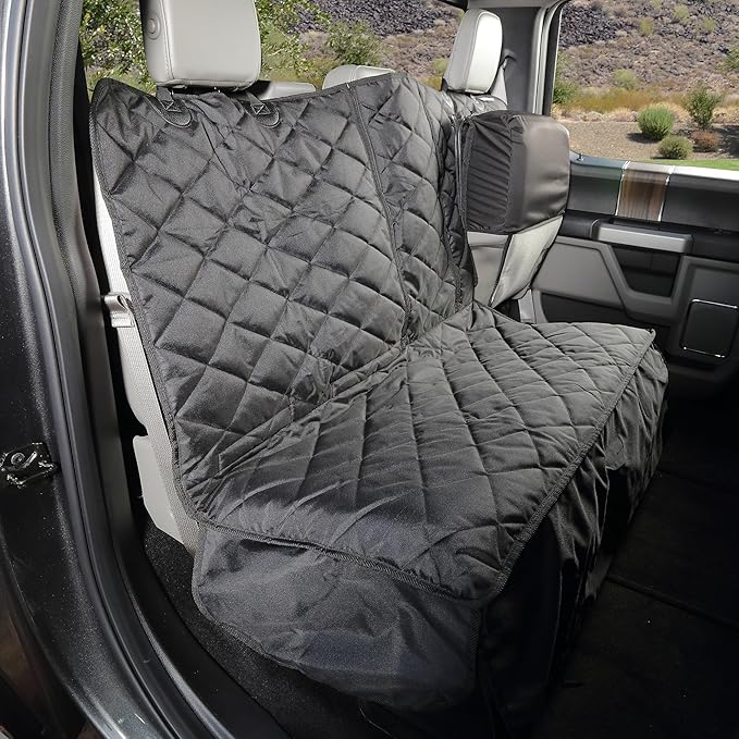 - FOR FULL-SIZE CREW CAB TRUCKS WITH 60/40 FILP-UP SEATS – Specifically engineered for full-size crew cab trucks with 60/40 fold-up split rear bench seats, this truck back seat pet cover for dogs offers durable protection against pet hair, dirt, and spills. It features a hammock design and 4Knines Split-Tech for easy access to fold-down seats and the middle armrest.