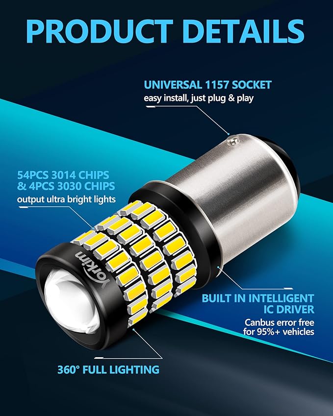 - 【ULTRA BRIGHT】 – Yorkim 1157 LED bulb is powered by 54 pcs 3014 & 4 pcs 3030 chipsets to offer 400% brighter lights than halogen bulbs for your vehicle