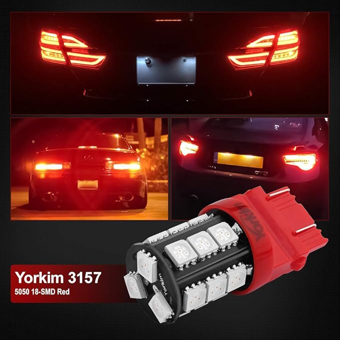 - 【SUPER BRIGHT】 – Yorkim 3157 Red LED bulbs are powered by 18 pcs of high quality 5050 chipsets to offer ultra brightness for your vehicle. 360 degree lighting angle, no blind spot, super brighter than the stock yellowish halogen bulb, updates your car interior to a modern look