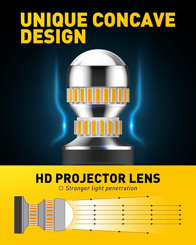 - Resembling halogen bulb shape design and sequencing 54 4014-SMD LED chips precisely around the 3157 led amber bulb. Delivering 360° high luminous efficiency with full amber light. Much easier noticed and much more safer driving