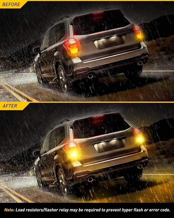 - Non-polarity. Can be used for front rear turn signal light, side marker light, blinker light, parking light, daytime running light, brake light, tail light, etc. When these 3157 led amber bulbs are used for turn signal lights or blinker lights, some vehicles may meet canbus issues, such as flicker, hyper flash or error warning, etc, load resistors or flasher relay may be required to solve the issues, you can contact us through Amazon Buyer Message to get help and solutions