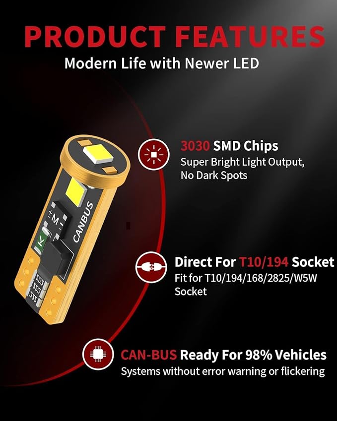 - 【CAN-BUS Ready】LASFIT 194 168 led bulbs have built-in CANBUS system, compatible with 98% vehicles, preventing from error code, odd flickering, and radio interference. However, these bulbs still can't prevent some Mercedes-Benz, VW, Jeep(when the replacement for license plate light and parking light) from throwing an error code.