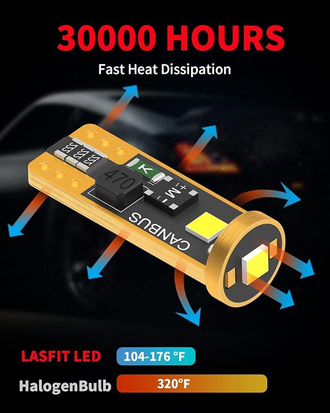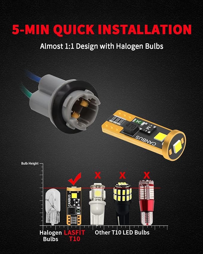 - 【CAN-BUS Ready】LASFIT 194/168 led bulbs have built-in CANBUS system, compatible with 98% vehicles, preventing from error code, odd flickering, and radio interference. However, these bulbs still can't prevent some Mercedes-Benz, VW, Jeep(when the replacement for license plate light and parking light) from throwing an error code.