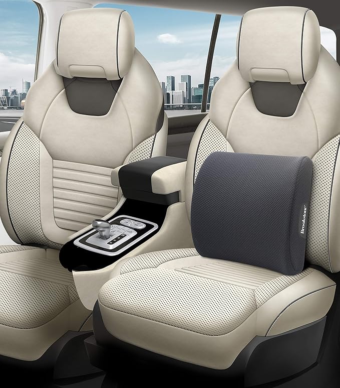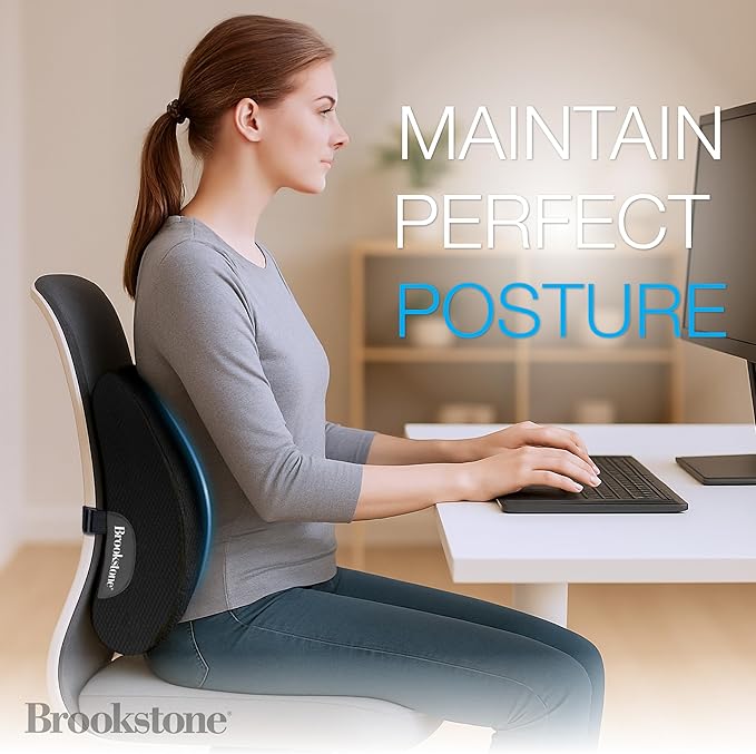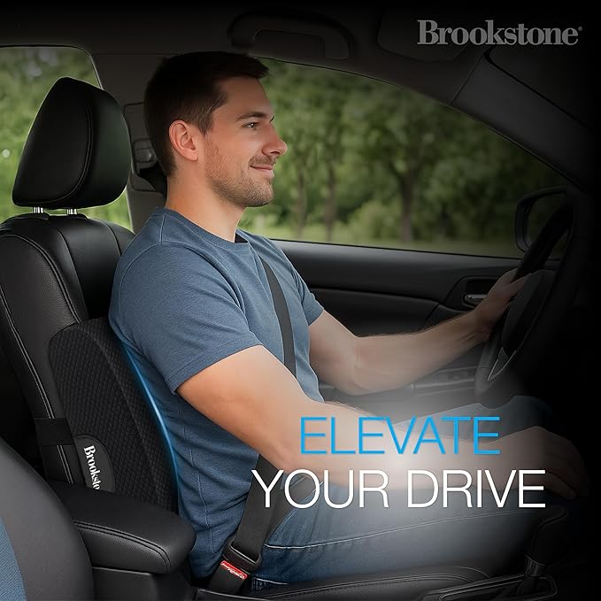 Brookstone BK1209 - Luxurious Lumbar Support Pillow for Car or Office Chair, Back Cushion with Premium Grade Memory Foam, Breathable and Washable Cover, Adjustable Strap