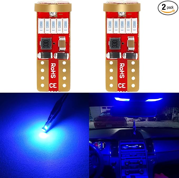 - (Pack of 2)Working voltage: 10V~30V, Current: 0.17A, Power: 2W/bulb, Color: blue, Lumen:500lm/bulb, Width: 0.39", Length: 0.97". Each 168/194 bulb has 15 pieces of 4014 led chips, 360 degree lighting angle