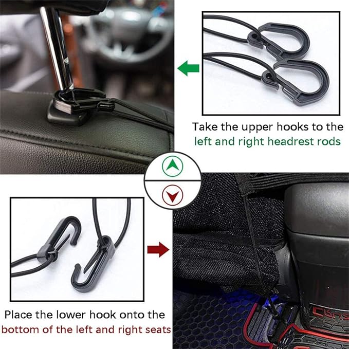 - Simple and easy to install : 4 reliable safety hooks that makes the whole storage mesh simple hook up to the headrest pole and the edge of any object under the seat within 1 min. No tools and no noise