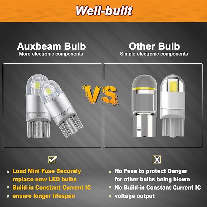 - Application: 10pcs auxbeam white 194 led bulbs, these white 194 led bulbs can fit many positions: License Plate Light / Interior Door Light / Parking Light / Side Marker Light/ Trunk Cargo Light / Dome Light / Courtesy Light / Map Light / Glove Box Light
