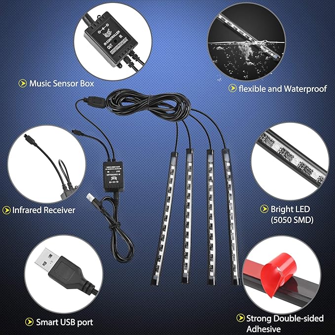 - Package Includes: 4 x SMD5050 Car LED Light Strip; 1x Smart USB Port; 1x Product Manuel.