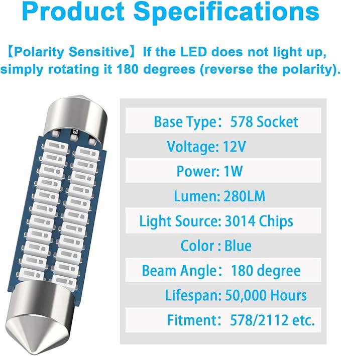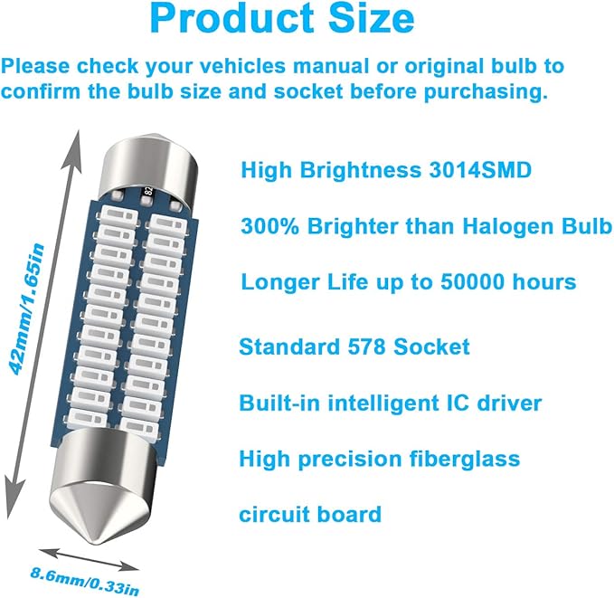 - ✔【Important Attention】The 578 led Festoon bulb size may vary between the model or trim of your vehicle.6 Sizes: 28mm, 31mm, 36mm, 39mm, 42mm, 44mm etc. We recommend that you check your vehicles owners manual or the original bulb to confirm the bulb size and socket before placing an order.
