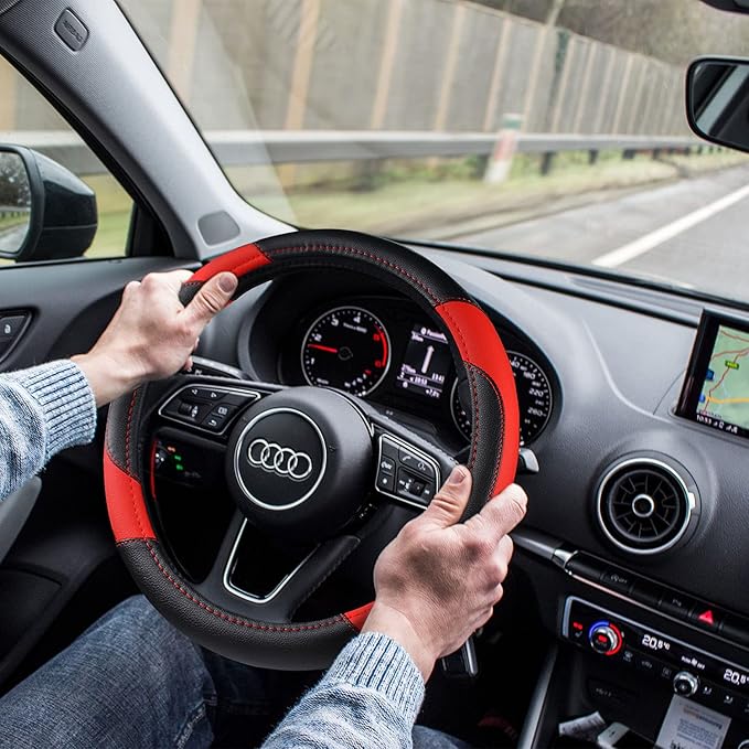 Leather Car Steering Wheel Cover, Non-Slip Car Wheel Cover Protector Breathable Microfiber Leather Universal Fit for Most Cars (Black & Red)