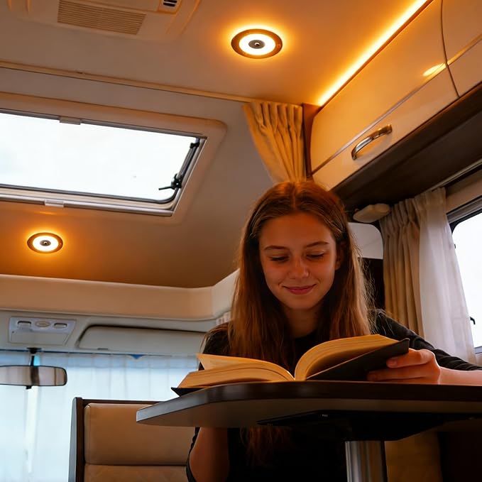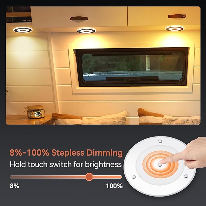 7.3 Inch 12 Volt LED Ceiling Dome Light, 720LM Dimmable Interior Light for RV Boat Camper Van Caravan Truck Motorhome Interior Lighting, Blue Light & Touch Switch(Warm White)
