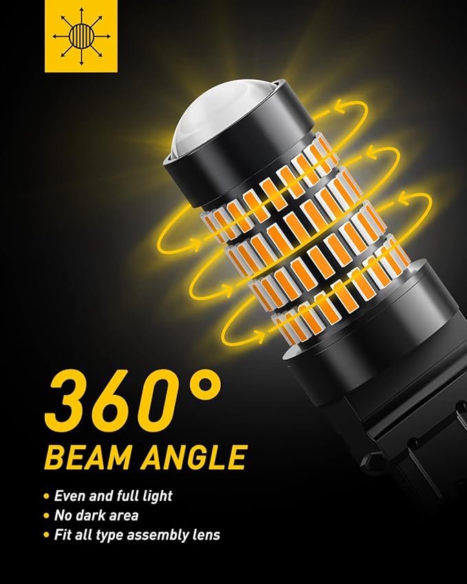 - 【360°LIGHTING】Each 3157 amber led bulb equipped with 102 pieces high power 4014 led chips, no dark spots. These 3157 led bulbs are protected with HD projector ensures optimal visibility and stronger light penetration