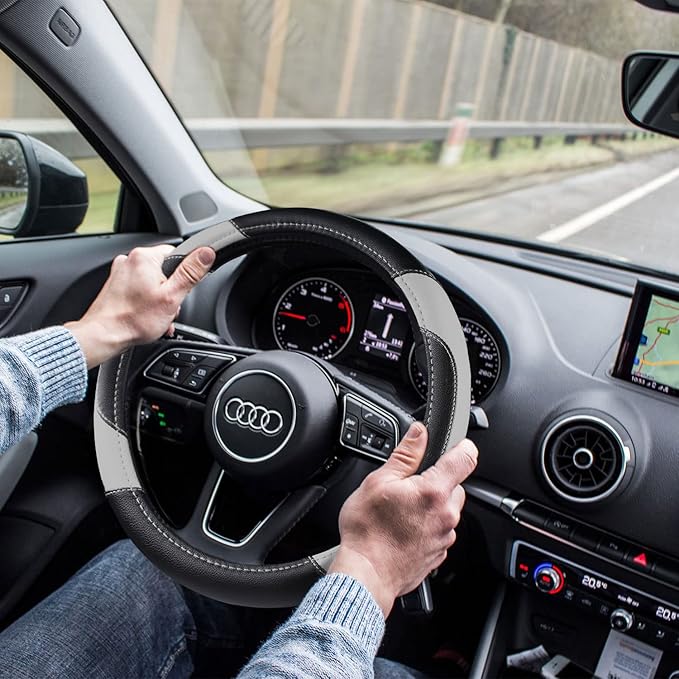 Leather Car Steering Wheel Cover, Non-Slip Car Wheel Cover Protector Breathable Microfiber Leather Universal Fit for Most Cars(Grey)