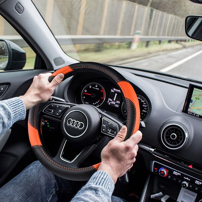 Leather Car Steering Wheel Cover, Non-Slip Car Wheel Cover Protector Breathable Microfiber Leather Universal Fit for Most Cars (Orange-2)