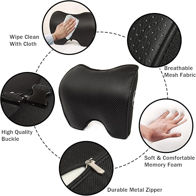- [Breathable and easy to clean] this neck rest car headrest pillow is made of high-end and wear-resistant leather material, the leather is not easy to damage, soft and skin-friendly. There are many breathable holes on the leather car pillow, breathable and heat dissipation, suitable for all seasons.The headrest pillow case can wipe the dust with a wet cloth, or remove it by unzipping the back of the car headrest, wash it with a sailor to dry, and reuse it to reduce economic expenses.