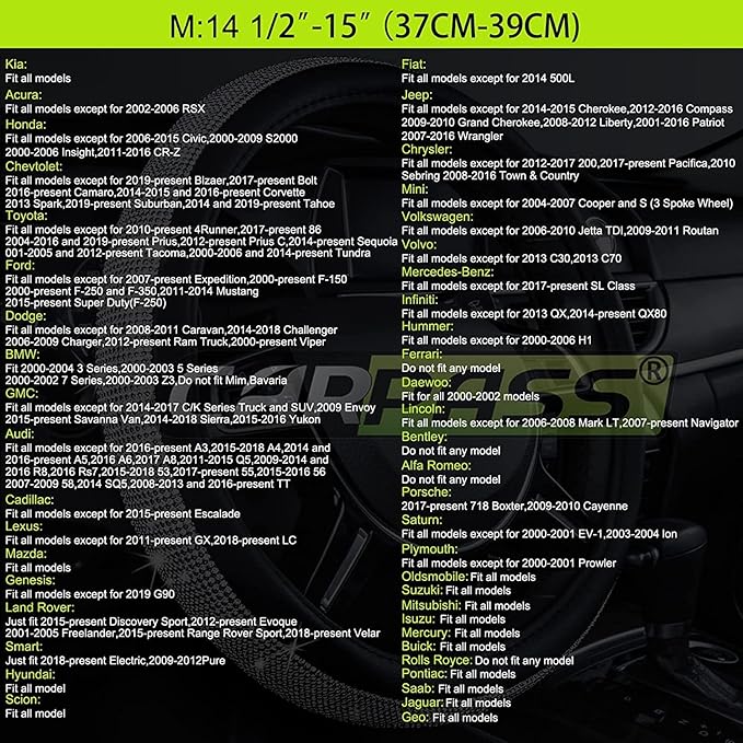 - UNIVERSAL FIT:Fits for Standard-size steering wheels with diameter 14 1/2 inch to 15 inch(37cm to 39cm)