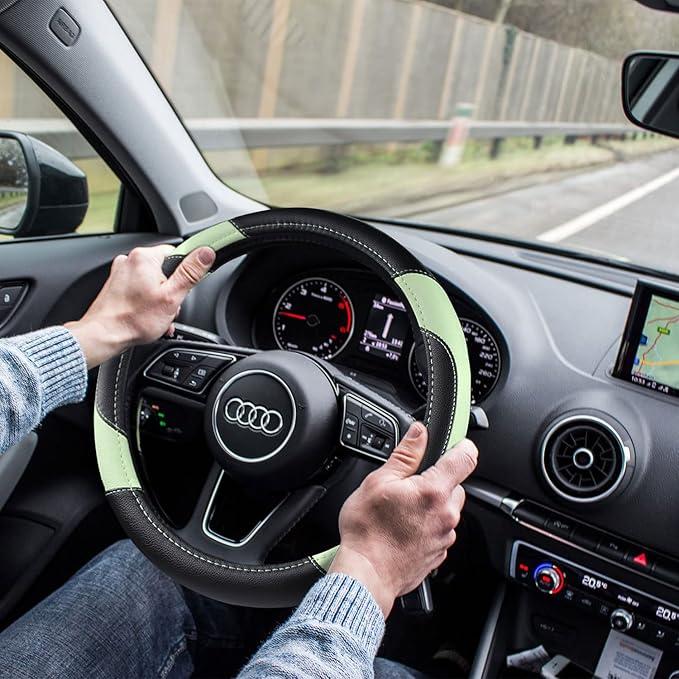 Leather Car Steering Wheel Cover, Non-Slip Car Wheel Cover Protector Breathable Microfiber Leather Universal Fit for Most Cars (Green)