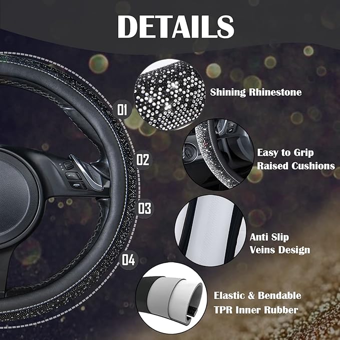 - LUXURY AND FASHION: Great Touch Feeling. Sparkle rhinestone massage your palm and relieve driving fatigue. This cute steering wheel cover not only bringing you an excellent visual feel, but also relieving you from driving fatigue, more comfortable and soft touch. Diamond steering covers sparkle in the sun, add a luxurious brilliance to your car, perfect for a girlfriend birthday gift.
