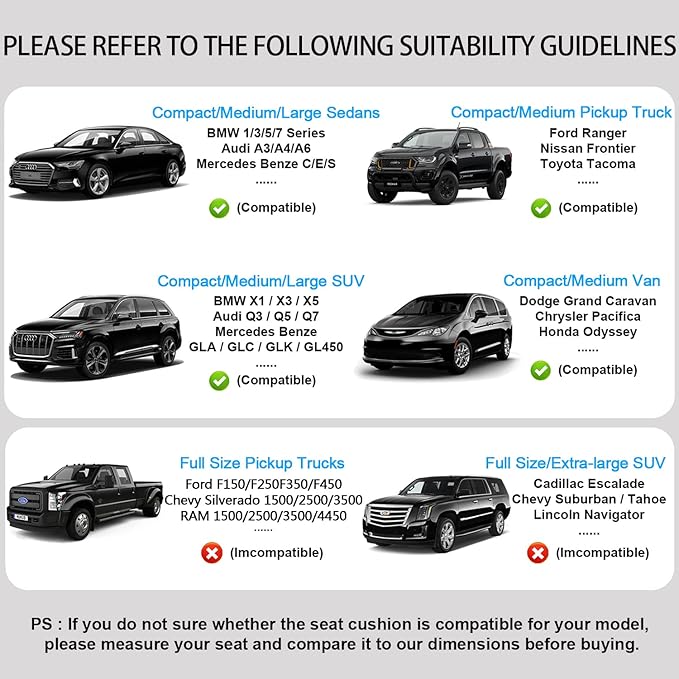 - 【Compatible Dimension】This seat cover dimension: 20.9'' x 20.5' (53x52cm), fits for most vehicles as small, medium size cars to Sedan/SUV/Van/Pickup Trucks. To ensure the best chance of a great fit, please measure your seat and compare it to our dimensions before purchase.