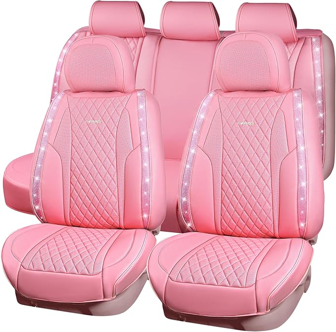 CAR PASS Pink Nappa Leather Car Seat Covers for Full Seats, Bling Diamond Waterproof Seat Protectior Universal Fit Auto SUV Sedan Truck Glitter Sparkly Shining Rhinestone for Women Girl, Pink Leather