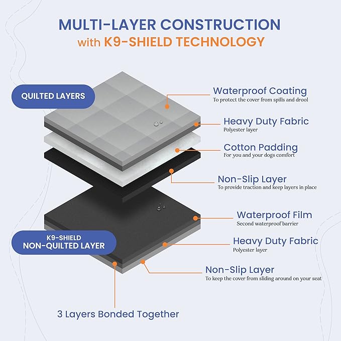 - MAXIMUM PROTECTION FOR YOUR TRUCKS: Designed with K9-Shield, a special textile laminate developed by 4Knines, this rear seat protector for dogs offers the best defense against water, dirt, and pet messes. The non-slip backing ensures it stays in place during travel, while the waterproof bottom layer protects your seats. Please note, it’s not chew proof, so avoid leaving your pet unsupervised.