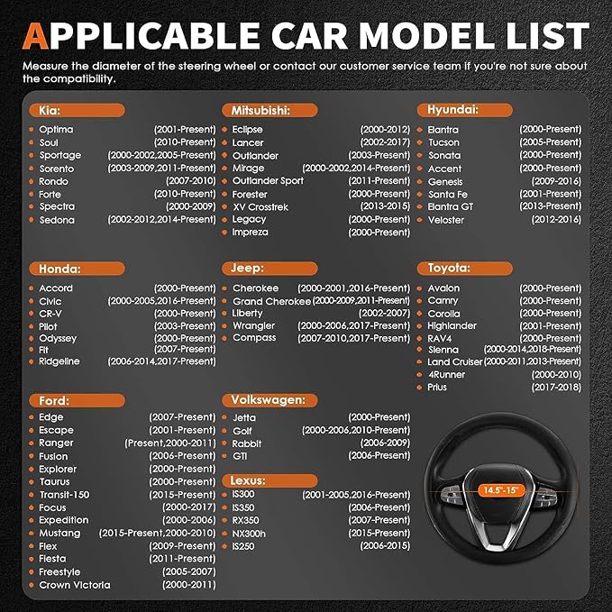 - WIDE APPLICATION: Featuring a universal size, HOTOR PU leather car steering wheel cover suits car steering wheel with a diameter of 14.5 to 15 inch(about 37 to 38cm). It's applicable to most cars like sedans, SUVs.