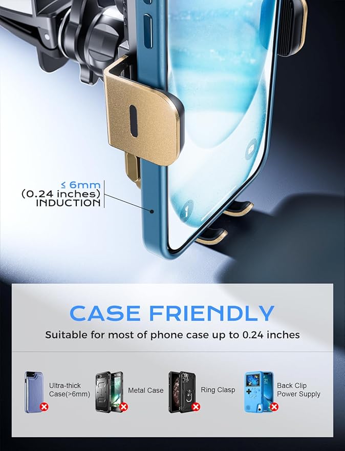 - 【Case Friendly & Flexible Angle Adjustment】Enjoy hassle-free charging through phone cases up to max 4mm(0.16 inch) thick with our CHGeek phone holder for car. This product is not compatible with otterbox phone case (its thickness is too thick). Please note that metal cases, magnets, credit cards, grips, and stands may interfere with charging. For optimal viewing and safe driving, the 360° rotating sphere and retractable & foldable bracket allow you to adjust the angle to your preference. The Otterbox phone case is too thick, causing it to be incompatible with this wireless charger.
