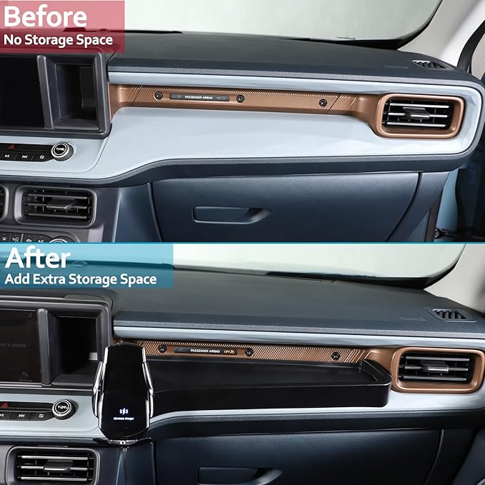 - 【Multifunctional Dashboard Phone Holder Cradle 】The Ford Maverick dash organizer can be used as a phone holder and can be used to store glasses or anything that you want to store. Auto Interior Storage Accessories Make full use of space to make your tidier!