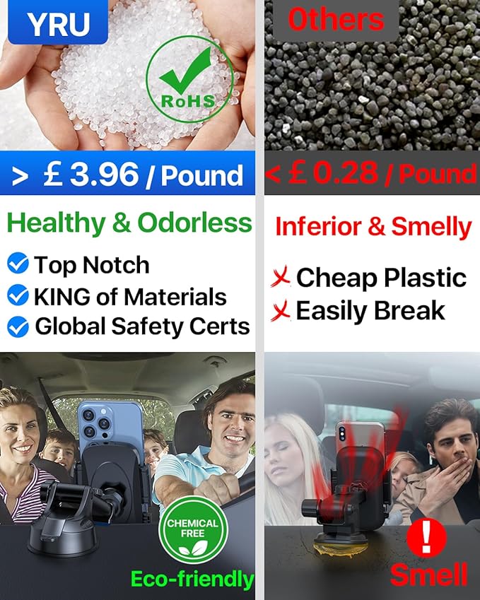 - [Millions of Drivers Choose YRU] Thanks to 200+ material tested, 250 models optimized, and 60000Miles+ bumpy road tests, the YRU R&D team designed the upgraded windshield/dashboard car phone mount. The convinced structure was certified by RoHS, CP65, and REACH