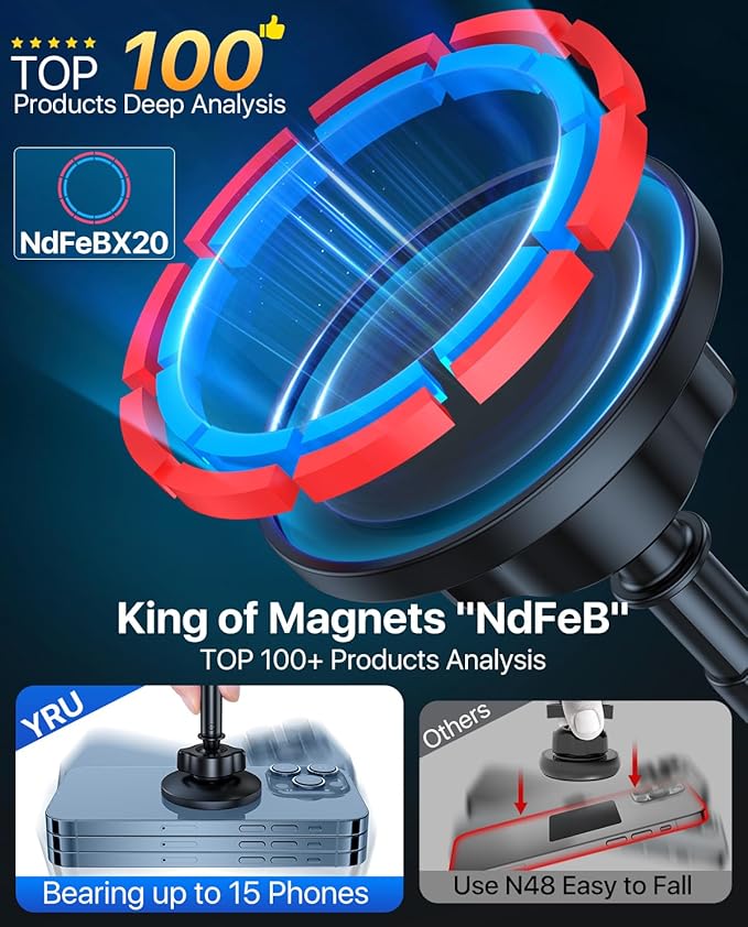 - [Strongest Magnets, Super Stability] Overcome all weaknesses of the traditional magnetic holders, YRU car magnetic phone mount for iPhones uses the King of Magnetism "NdFeB Magnets" which is powerful enough to hold 15 large phones. Grip the phone securely on braking or rough roads. Maintains its strong magnetism in the harsh environment of -45°F~215°F