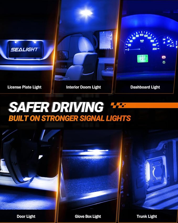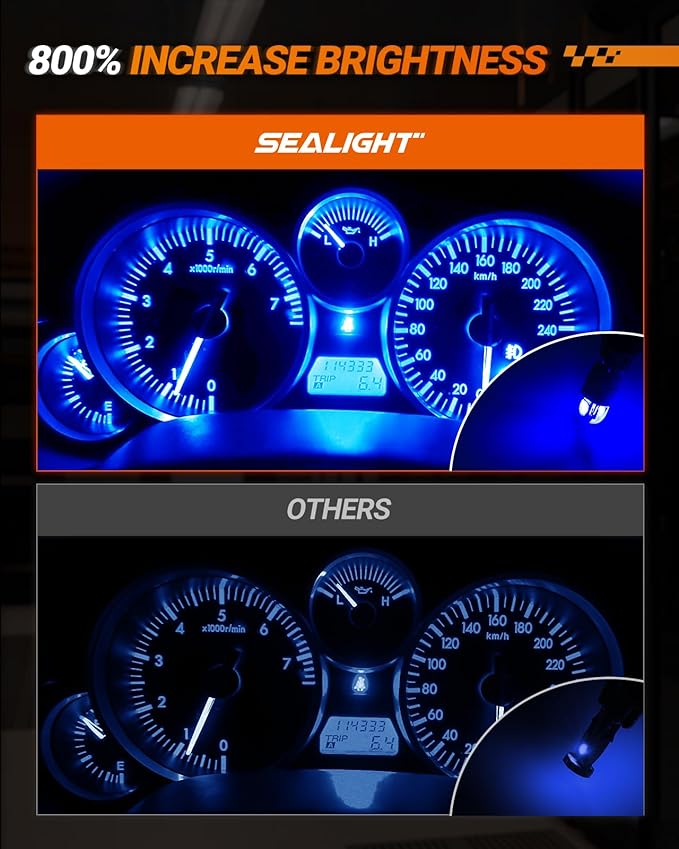 - 【800% Brighter Than Halogen Bulb】 Sealight is equipped with a 3030 high-performance light bulb chip. Super bright blue light. 360 ° lighting angle, no dark spots, and huge brightness. Bring pure white and ultra bright light output to your car.