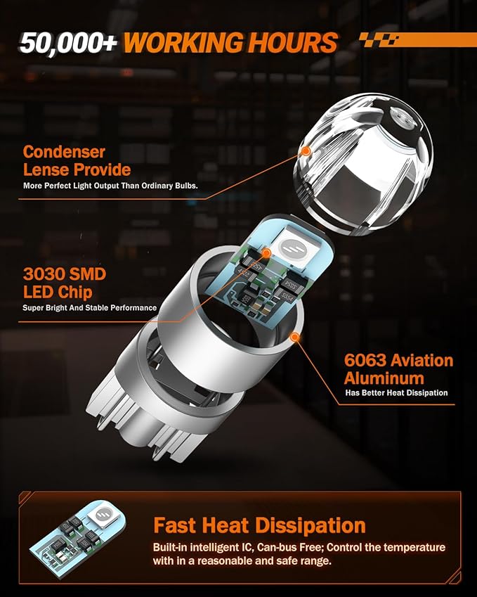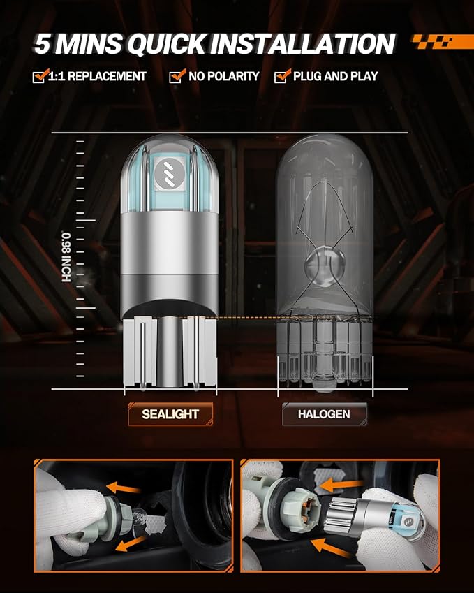 - 【1 To 1 Replacement Design】 The sealed light bulb is designed with reference to halogen lamps, achieving the same luminous positions and a perfect fit with a wedge-shaped base. No polarity, plug and play, can be installed in 5 minutes.