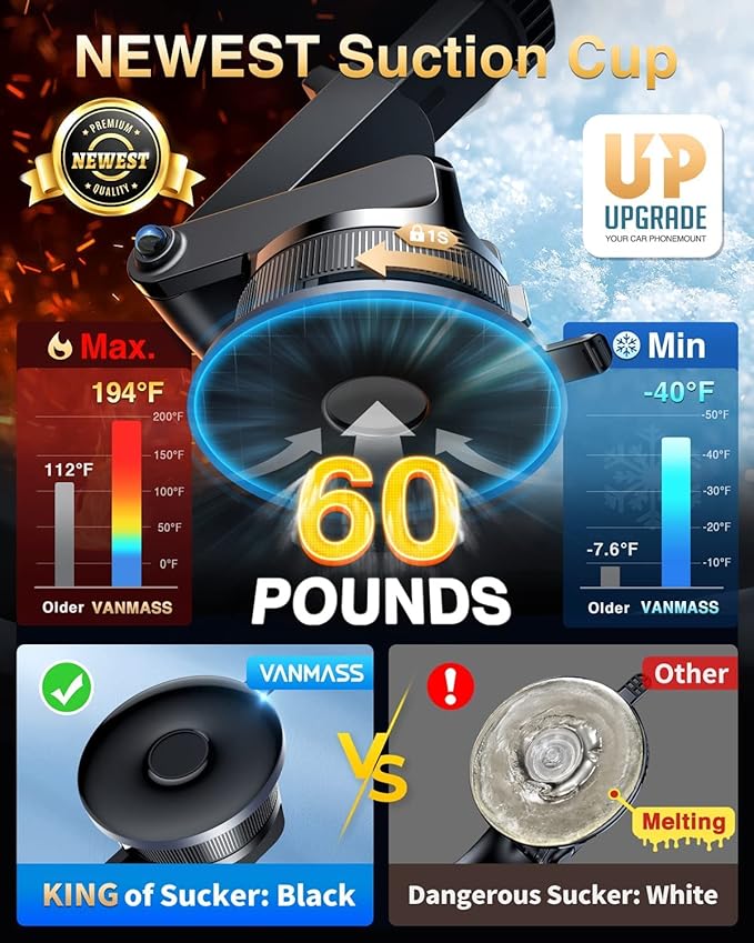 - 【High-end = Quality Materials + Grandmaster Design】VANMASS car phone mount made of PC+ABS material has passed 4 environmental reliability tests and has a temperature resistance range of -40℉ to 194℉, it is also highly resistant to UV rays (Ensuring reliability even in the sun), and the telescopic pole uses a reinforced sliding rail structure to greatly reduce wobbling during driving. This suction phone cradle obtained CP65 / REACH / RoHS safety certifications