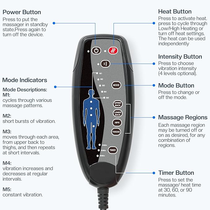 - [Customized Massage Settings] CILI chair massager pad offers 5 massage modes, allowing you to select the full-body massage or target specific areas such as the upper back, lower back, hips or thighs according to your preferences. The chair massager for recliner provides four-speed massage intensities to cater to your individual needs. Enjoy the flexibility of personalized settings for a truly customized massage experience.