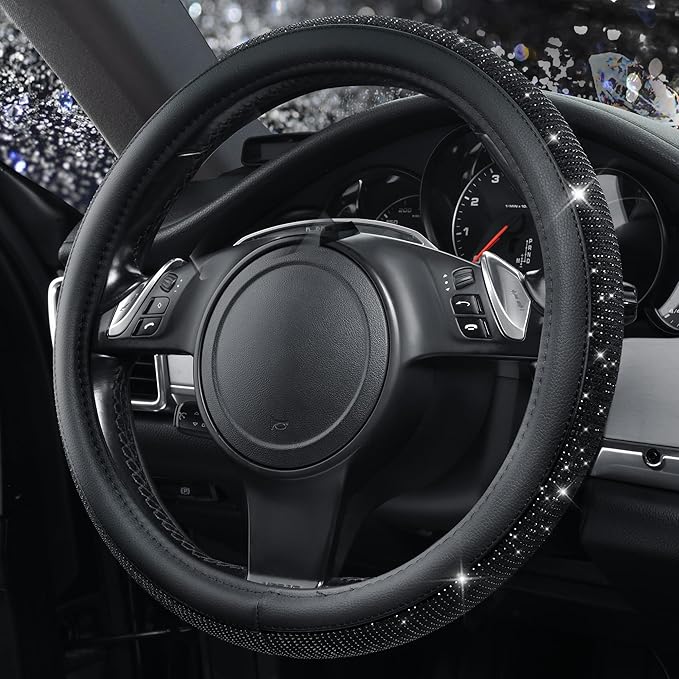 - DIAMOND & LEATHER: Premium Quality Material: PU Leather and Top diamond craft work.The black diamonds on the velvet. The Bling Crystal Steering Wheel Cover made of durable microfiber leather and diamond, consisted hundreds of shiny rhinestones. Super Sparkly, Better Spotlight, Non-Dropping Diamond, Comfortable Feelings, does not scratch hands, and has good anti-slip effect.