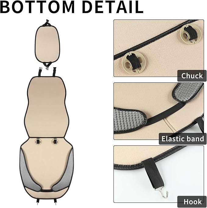 - 【Easy to install】 2 minutes after watching the video. The installation only needs 3 steps, just hang two metal hooks under the seat, clip the two chucks on the seat back, and fix the clips on the back cover and headrest cover.