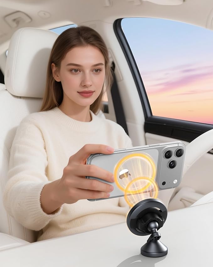 - 【Optimal Magnetic Balance】Equipped with N52-grade neodymium magnets, the MagSafe car phone mount provides an extremely strong magnetic hold, ensuring your phone stays securely attached, even on bumpy roads. Compatible with all MagSafe-enabled devices and MagSafe-compatible cases, it provides stability without compromising on ease of use. For non-magnetic case, just stick the metal ring provided outside the case. (NOTE: This car mount is designed solely for holding phones; no charging function.)