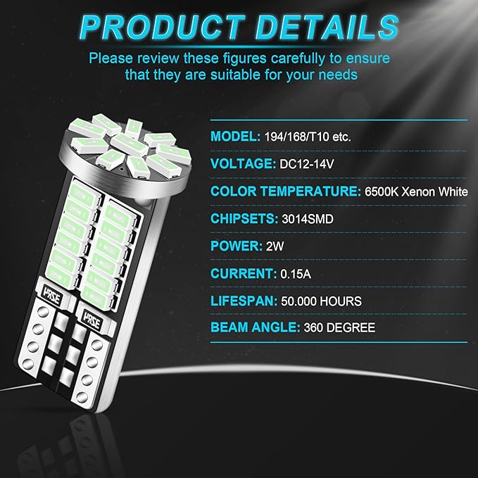 - 300% Brighter: Our 194 bulb has 34 pieces of 3014 led chips on it, 360 degree lighting angle, no blind spot.